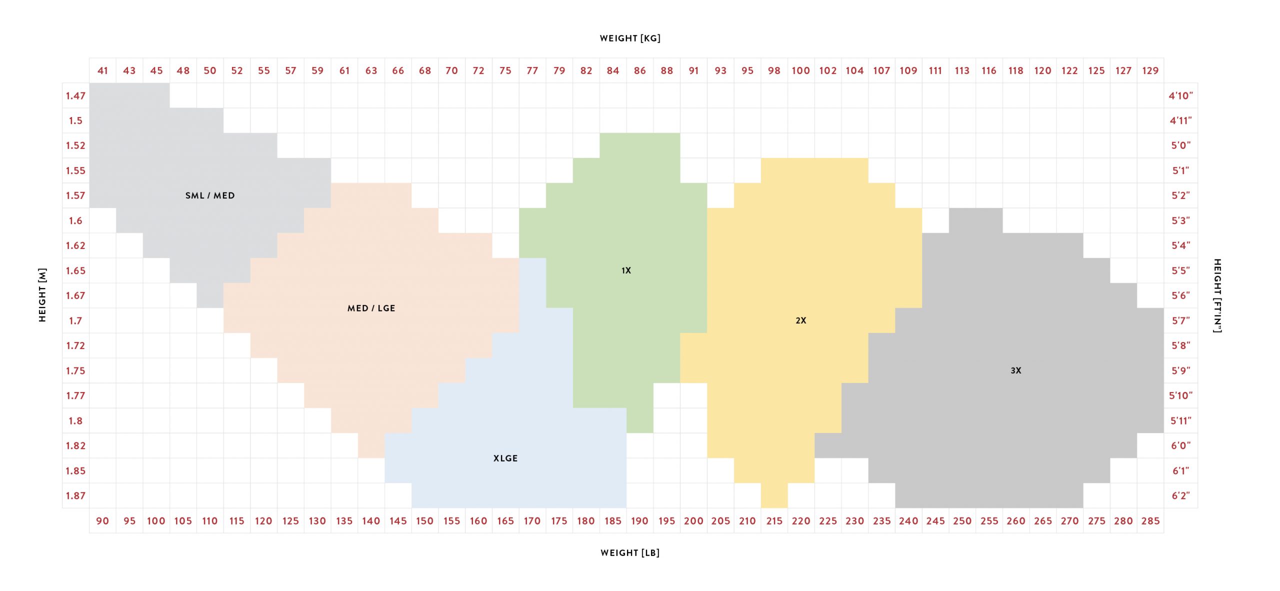 | GIRTH | 54-56 | 137-142 | 57-59 | 134-150 | 59-61 | 134-155 | 61-63 | 155-160 | 62-65 | 157-165 |