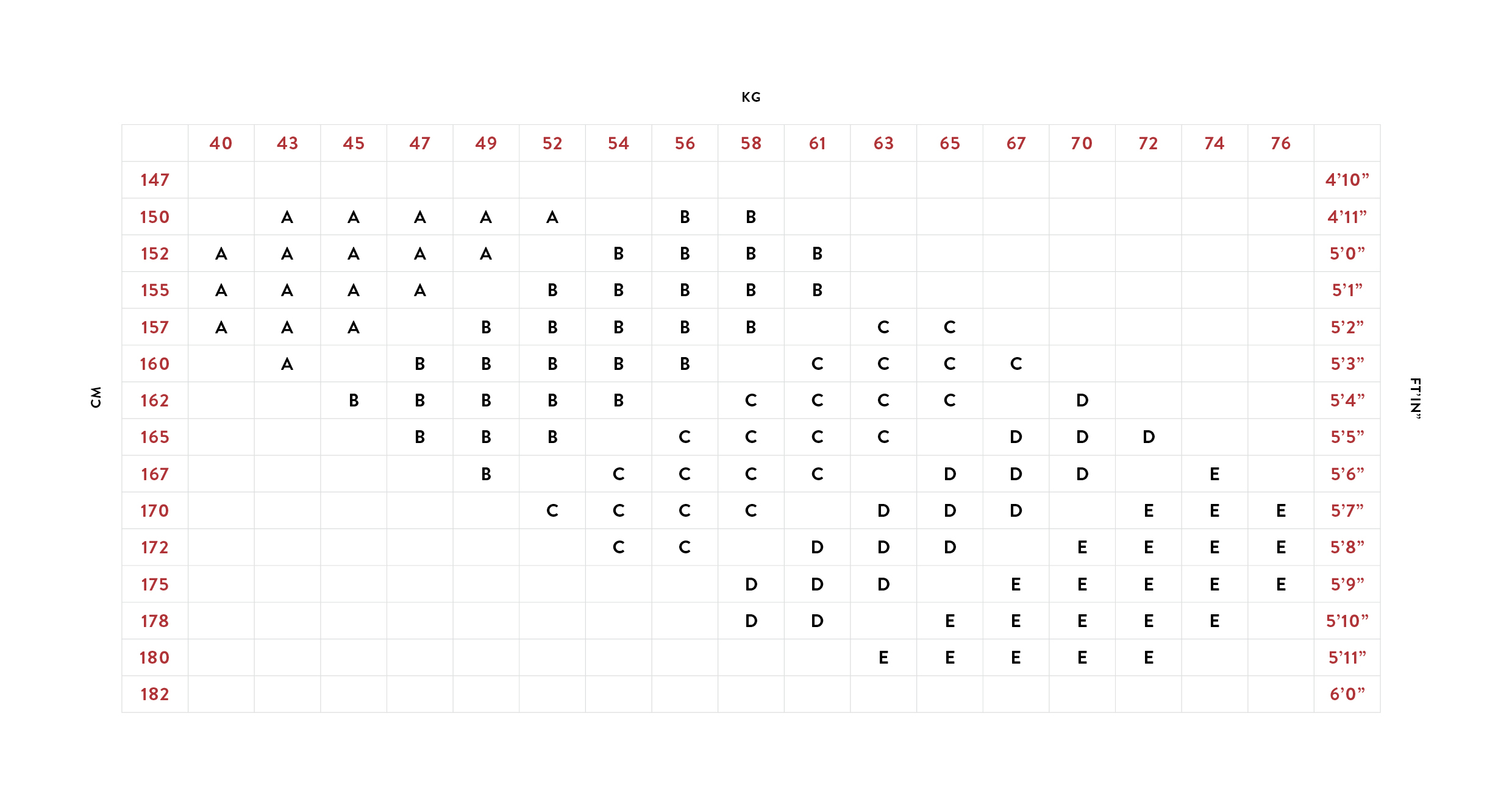 | GIRTH | 53-56 | 135-142 | 55-58 | 140-147 | 59-63 | 150-160 | 62-67 | 158-170 |